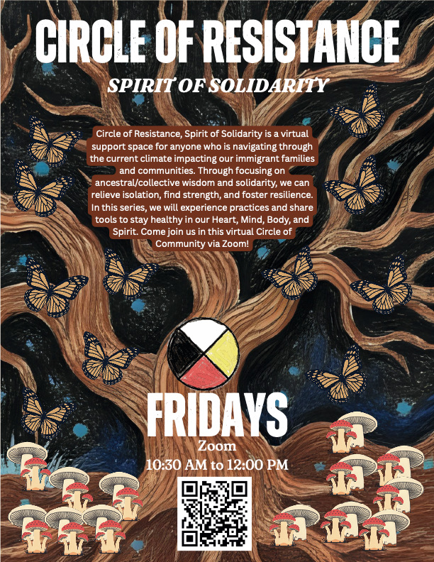 “Círculo de Resistencia, Espíritu de Solidaridad” ("Circle of Resistance, Spirit of Solidarity") es un espacio virtualde apoyo para cualquier persona que esté sobrellevando los efectos del clima actual que afecta a nuestras familias y comunidades inmigrantes. Al enfocarnos en solidaridad, y la sabiduría ancestral y colectiva, podemos aliviarel aislamiento, encontrar fuerza y fomentar la resiliencia. En esta serie, compartiremos prácticas y herramientas para mantenernos sanosen nuestro Corazón, Mente, Cuerpo y Espíritu. ¡Únase a nosotros en este Círculo de Comunidad virtual a través de Zoom! Los facilitadores serán Alejandro Ruelas-Mora y Edmundo Norte. Si tienen alguna pregunta, pueden contactar a Alejandro por correo electrónico a la dirección MHWC6@deanza.edu.